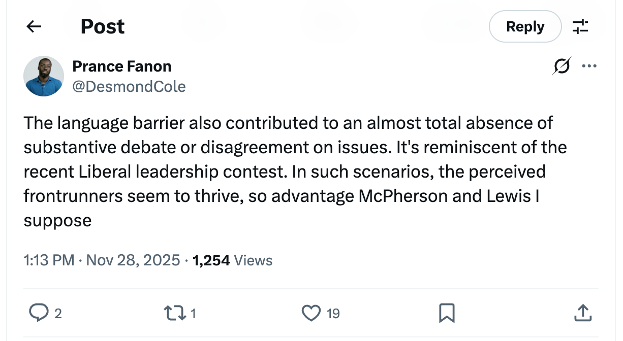Further to this, and beyond the question of the debate’s erroneous branding, it’s worth underscoring what the failure of 3/5 candidates to address Quebecers in even passable French ultimately signifies for a national party. 22% of the Canadian population, nearly 1 in 4, speaks French as a first language. Within Quebec itself, — to state the obvious — it’s overwhelmingly the native language and, beyond this, absolutely foundational to both civic and cultural identity.