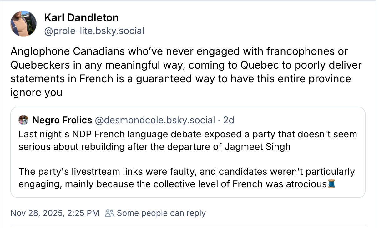 Since these limitations were well-known going in, it is nothing short of baffling that the party chose to brand the debate as it did, and the response has been predictably critical as a result. The two biggest winners, as Nora Loreto observes in her writeup, were probably the Bloc Québécois and the Liberals. The reaction in French language media, when it even took notice, has — to say the least — not been positive. Reacting to the headline “The NDP’s leadership candidates aren’t fluent in French. Will that hurt the party’s future?” the country’s best known francophone political journalist Chantal Hébert was characteristically blunt: “The short answer is yes…”.