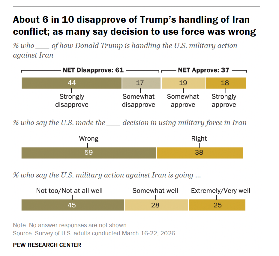 Among the most striking features of the US-Israeli war against Iran is the near total indifference of American elites in particular to public opinion. I was 14 when the Bush administration invaded Iraq and can still vividly remember the year of concerted propaganda that came beforehand. If you weren't born or were too young to remember, it's difficult to convey how aggressive this actually was. It was a campaign truly global in scope, advanced on multiple fronts, and something that showcased in pretty terrifying fashion the awesome power of the modern state and its media surrogates to manipulate public opinion. By the time the actual invasion was launched in March 2003, a majority of Americans were basically baying for blood and more than half had been convinced Saddam Hussein had been involved in 9/11.